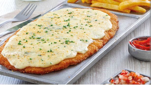 Milanesa en sus variantes de cerdo - carne o pollo con queso muzzarella y 1 huevo y fritas