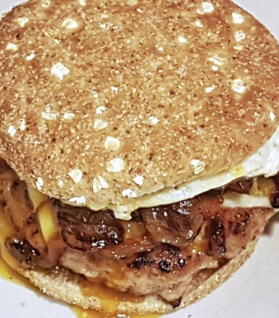 Burguer doble de carne de 130gr c/u con panceta, Huevo y cebolla caramelizada c/ Fritas