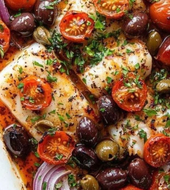Filet mediterraneo: filet de Merluza horneado con cherry confitados, alcaparras, cebolla morada, aceitunas negras
