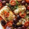 filet de Merluza horneado con cherry confitados, alcaparras, cebolla morada ,ajo, aceitunas negras