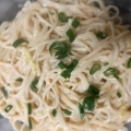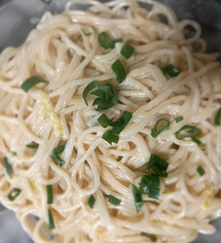 Pasta, cebolla de verdeo y crema.