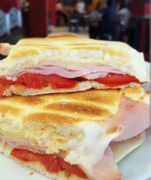 pan panini, jamon, queso, tomate y huevo a la plancha