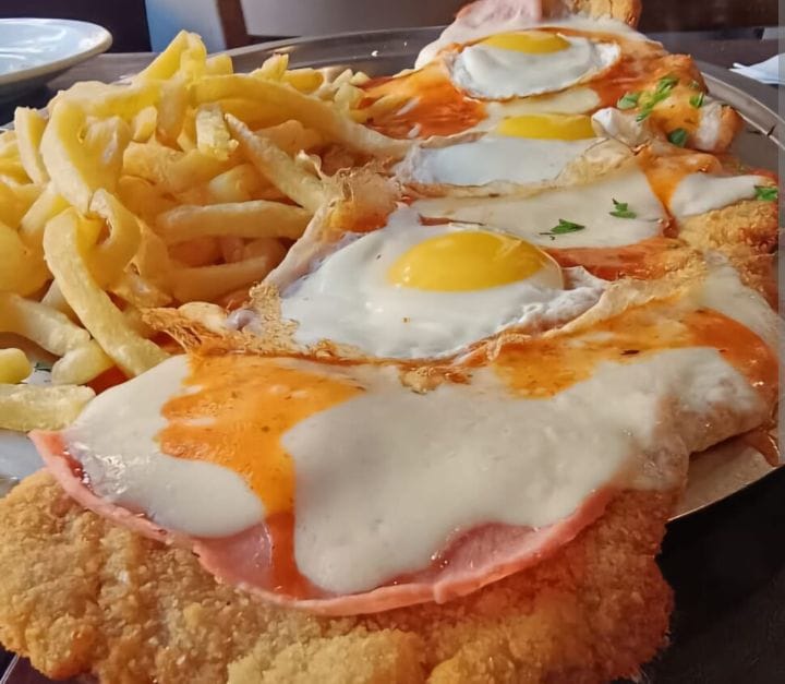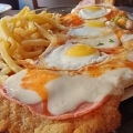 Milanesa en sus variantes de carne-pollo o cerdo con salsa de tomate muzza - y huevo a la plancha mas fritas