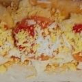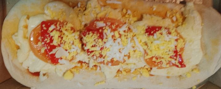 Masa de pizza casera, salsa, muzza, tomate y huevo