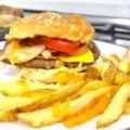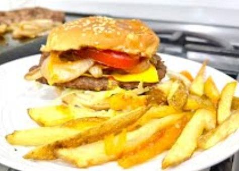 Hamburguesas en sandwich con jamón, queso, lechuga, tomate y huevo y papas fritas