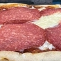 Masa de pizza casera , con salsa muzza y Rodajas de salame