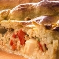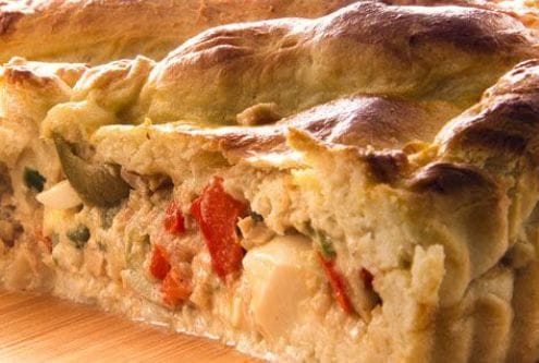 Tarta gallega Filet de merluza, cebolla, morrón y aceitunas negras.