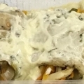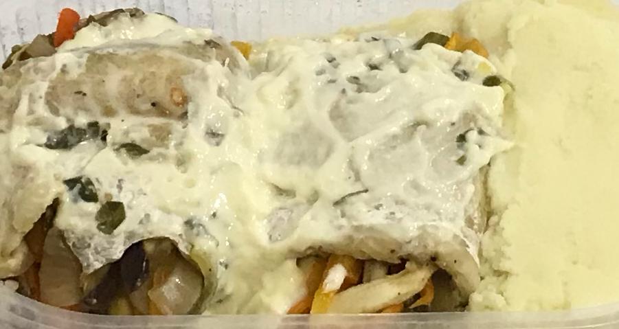 Arrollado de merluza, con vegetales en juliana al horno, con crema y guarnición de puré