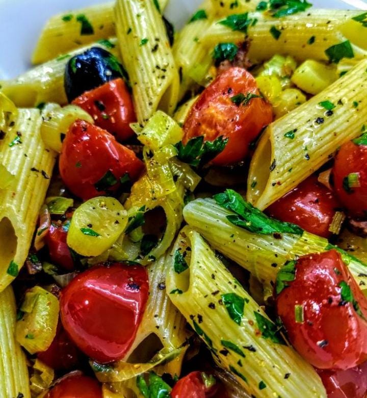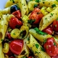 Rigatti con rúcula, cherry, espinaca, aceitunas negras